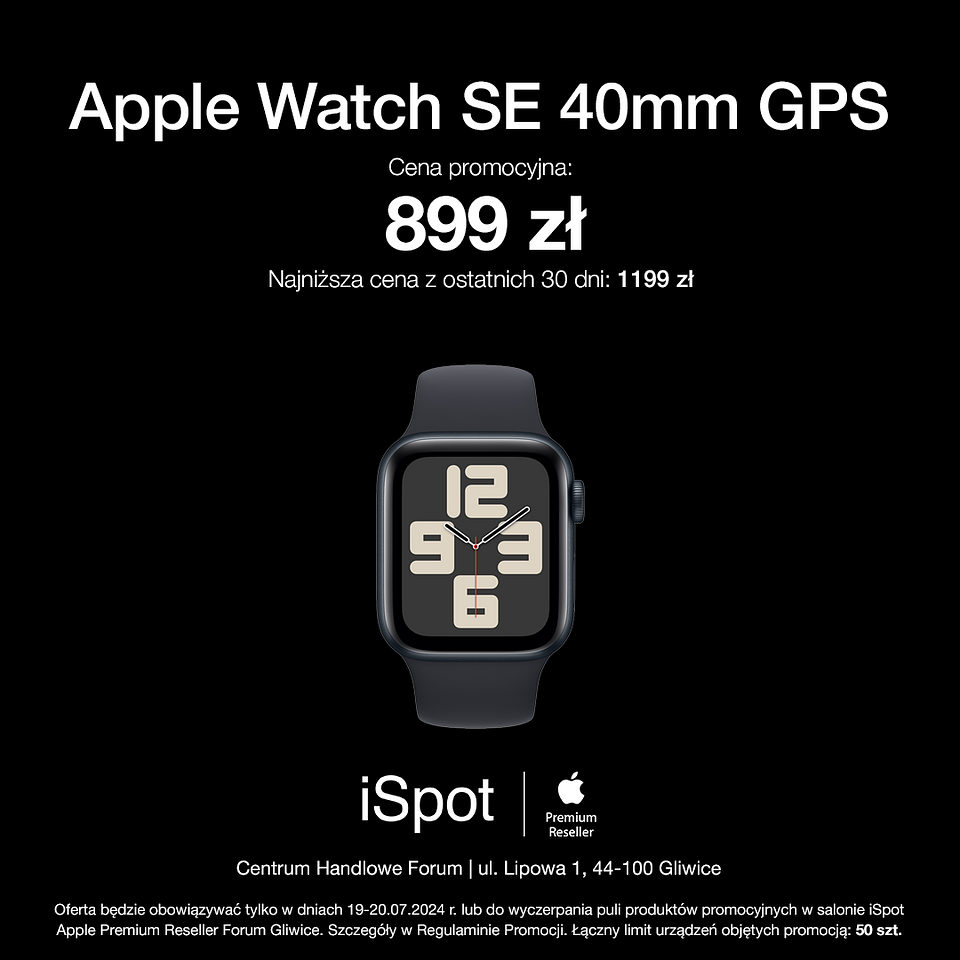 - Apple Watch SE 2023 40mm GPS w cenie 899 zł (Regularna cena sprzedaży: 1299 zł. Najniższa cena z ostatnich 30 dni: 1199 zł);