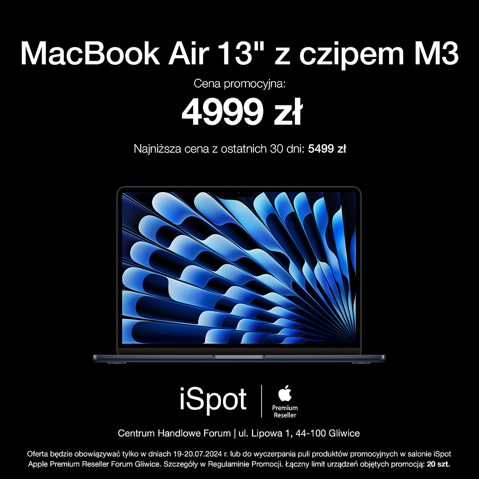 ul. Lipowa 1, 44-100 Gliwice *Oferta będzie obowiązywać tylko w dniach 19.07-20.07.2024 lub do wyczerpania puli produktów promocyjnych w salonie iSpot Galeria Forum Gliwice. Szczegóły w regulaminie promocji na stronie: https://ispot.pl/salon-apple-premium-reseller-w-forum-gliwice