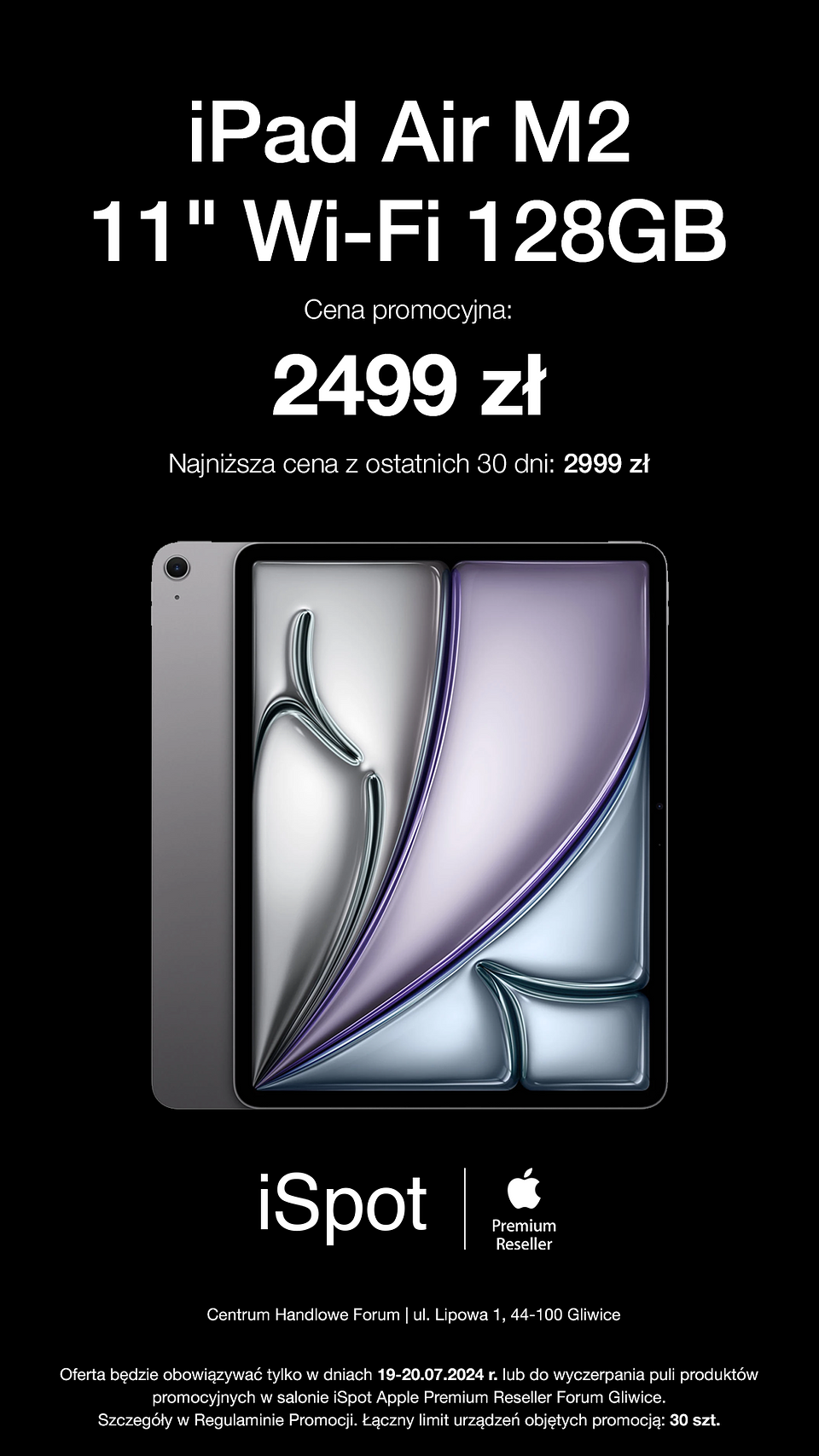 - iPad Air M2 11” Wi-Fi 128GB w cenie 2 499 zł (Regularna cena sprzedaży: 2999 zł. Najniższa cena z ostatnich 30 dni 2999 zł);