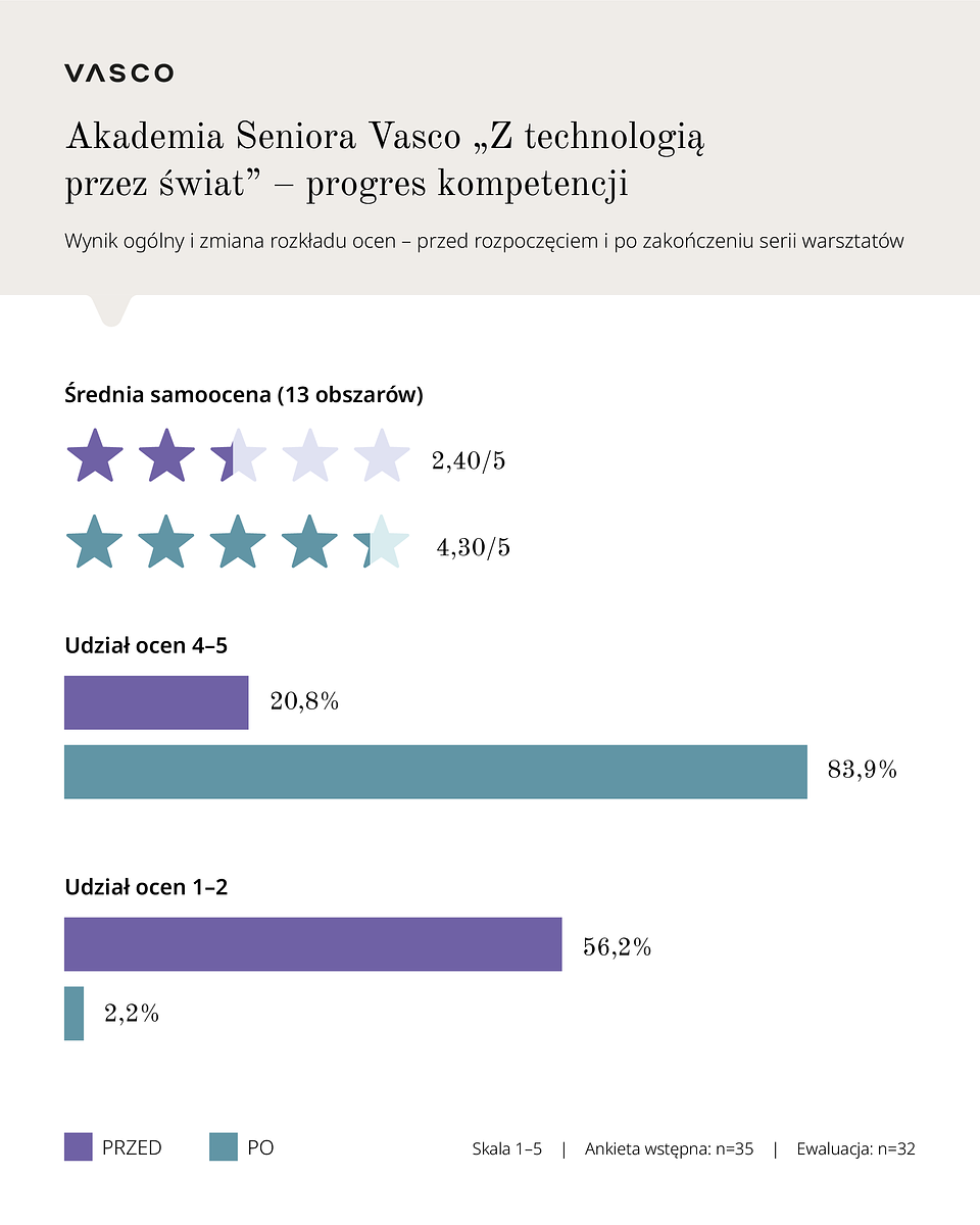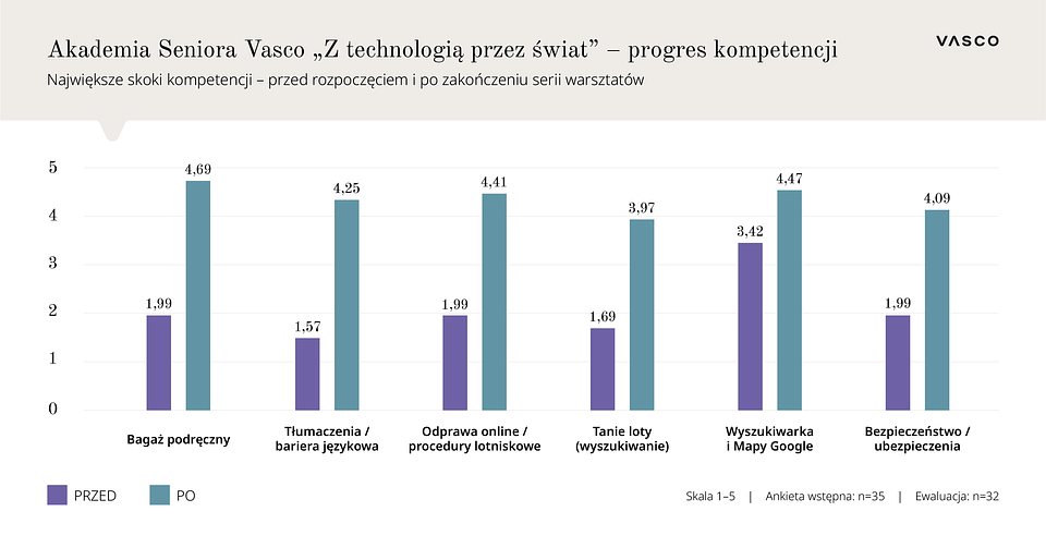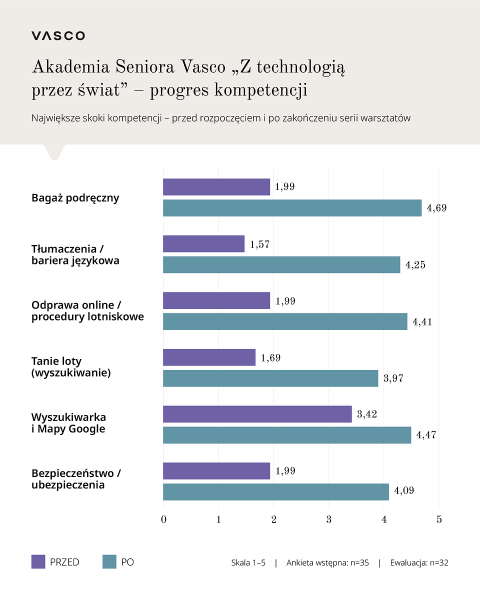 Akademia Seniora Vasco powstała jako odpowiedź na konkretne bariery, które - jak pokazują badania - wciąż ograniczają samodzielność wielu seniorów w podróży. W ankiecie przeprowadzonej przed startem programu ponad połowa uczestników nisko oceniła swoje kompetencje w wyszukiwaniu lotów, a 86% deklarowało, że nie radzi sobie z aplikacjami i urządzeniami do tłumaczeń.