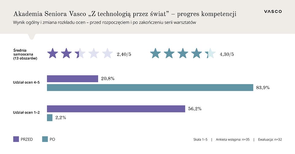 Wyniki badania ewaluacyjnego przeprowadzonego po zakończeniu programu jednoznacznie potwierdzają jego skuteczność. Uczestnicy Akademii oceniali swoje kompetencje w pięciostopniowej skali - od 1 (brak pewności) do 5 (pełna biegłość). Średnia samoocena w 13 kluczowych obszarach wzrosła z oceny 2,40 przed startem Akademii do 4,30 po jej zakończeniu, co oznacza przejście od poziomu „raczej niepewny" do „dobrze/bardzo dobrze”.